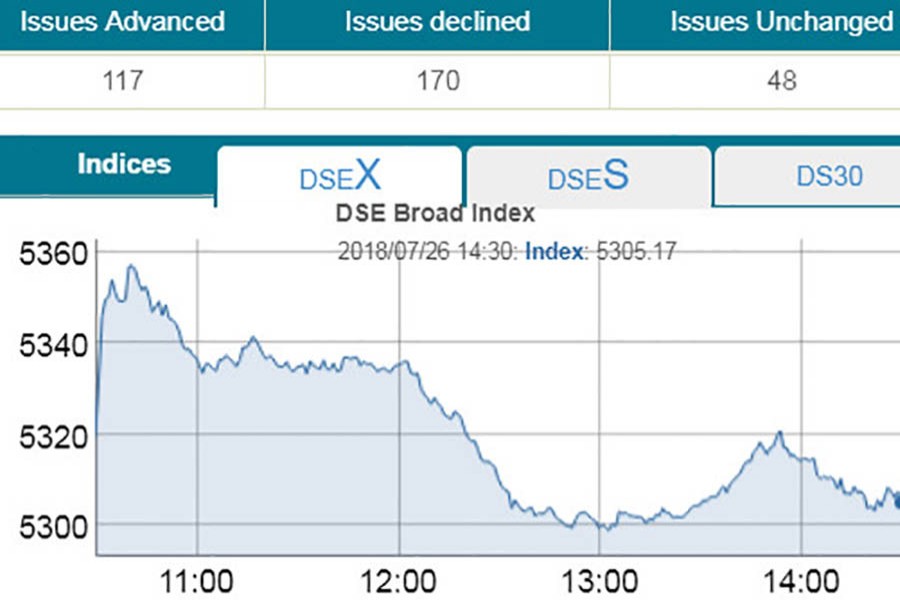At the end of the session, the DSE broad index—DSEX—settled at 5305.17 points with a marginal loss of 0.26 per cent or 14.27 points.