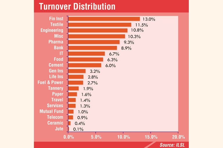 Beximco topped the turnover list with shares worth Tk 486 million changing hands, closely followed by LafargeHolcim (Tk 325 million), IPDC Finance (Tk 306 million), GSP Finance (Tk 253 million) and VFS Thread Dyeing (Tk 151 million).