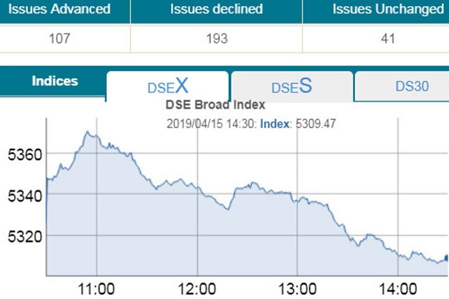 At the end of the session, DSEX, the prime index of the Dhaka Stock Exchange (DSE), went down by 16.91 points or 0.31 per cent to finish at 5,309.