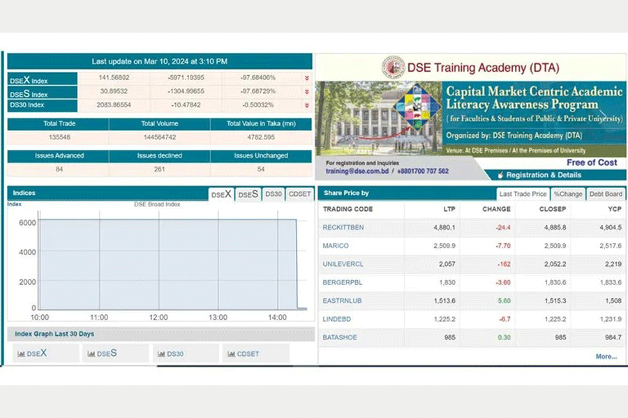 In Bangladesh, stock prices are limited to a maximum daily decline of 10 per cent. So, it is impossible for DSE index to come down by 98 per cent in one day.