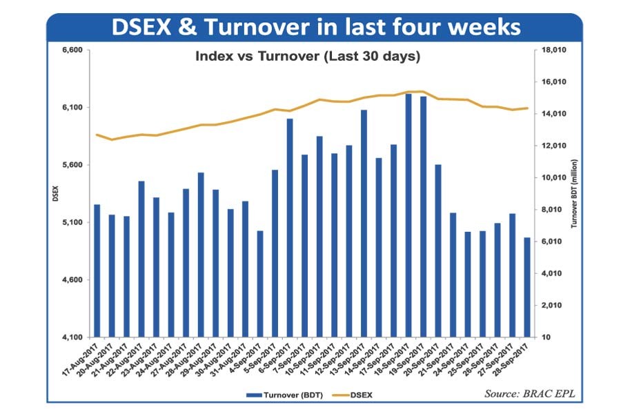 In fact, the premier bourse started to observe the turnover below Tk 10 billion from September 21 and continued till Thursday last.