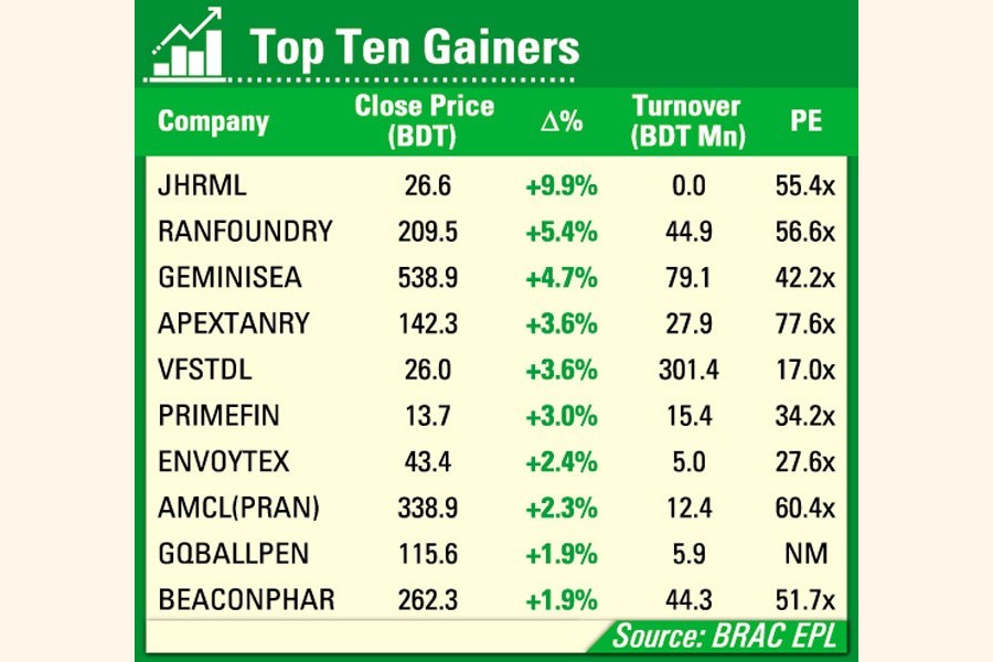 IPDC Finance topped the turnover list for the second straight session with shares worth nearly Tk 509 million changing hands, followed by VFS Thread Dyeing (Tk 301 million), Beximco (Tk 296 million), LafargeHolcim (Tk 176 million) and Nahee Aluminum (Tk 169 million).