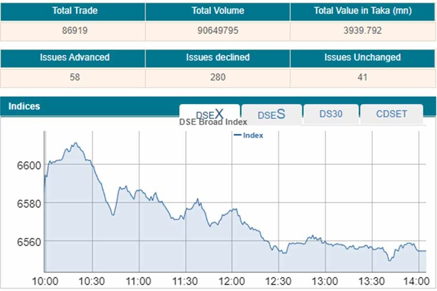 Along with lower turnover, DSEX, the prime index of Dhaka Stock Exchange, went down by 30.10 points or 0.45 per cent to settle at 6,554, after gaining nearly 11 points in the previous sessions.