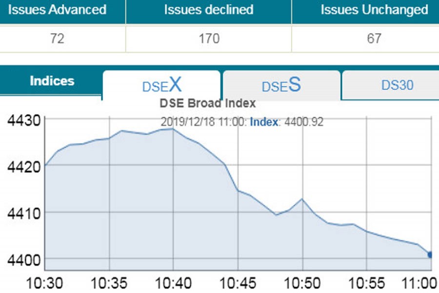DSEX, the prime index of the DSE, went down by 23.06 points or 0.52 per cent to stand at 4,396 at 11:00am.