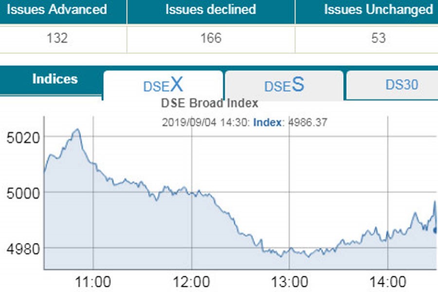 DSEX, the prime index of the Dhaka Stock Exchange, lost 20.68 points or 0.41 per cent to settle 4,986, which is the six weeks low. DSEX also plunged below 5,000-mark on July 22 this year.