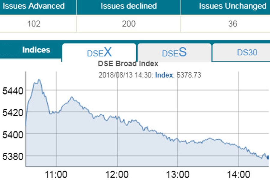 At the end of the session, DSEX, the prime index of the Dhaka Stock Exchange (DSE), went down by 28.45 points or 0.52 per cent to settle at 5,378.