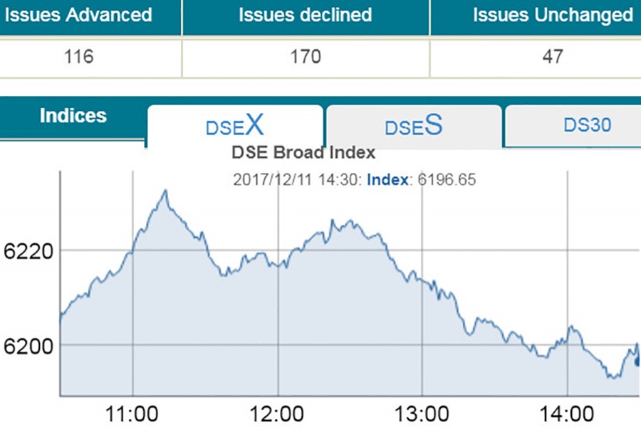 DSEX, the prime index of the Dhaka Stock Exchange (DSE), went down by 7.78 points or 0.12 per cent to settle at 6,197.