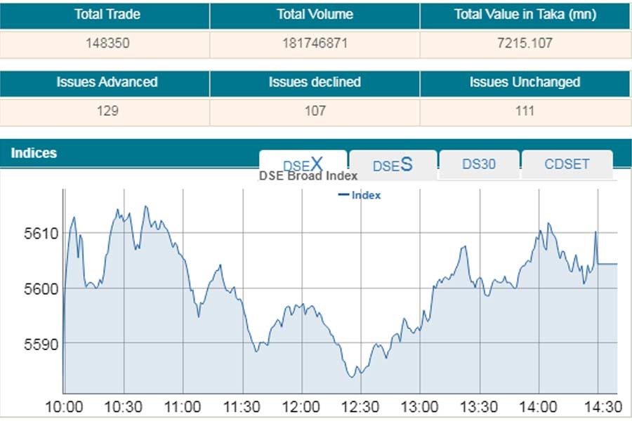 DSEX, the prime index of the DSE, went up by 20.08 points or 0.35 per cent to settle at more than one month high at 5,604.