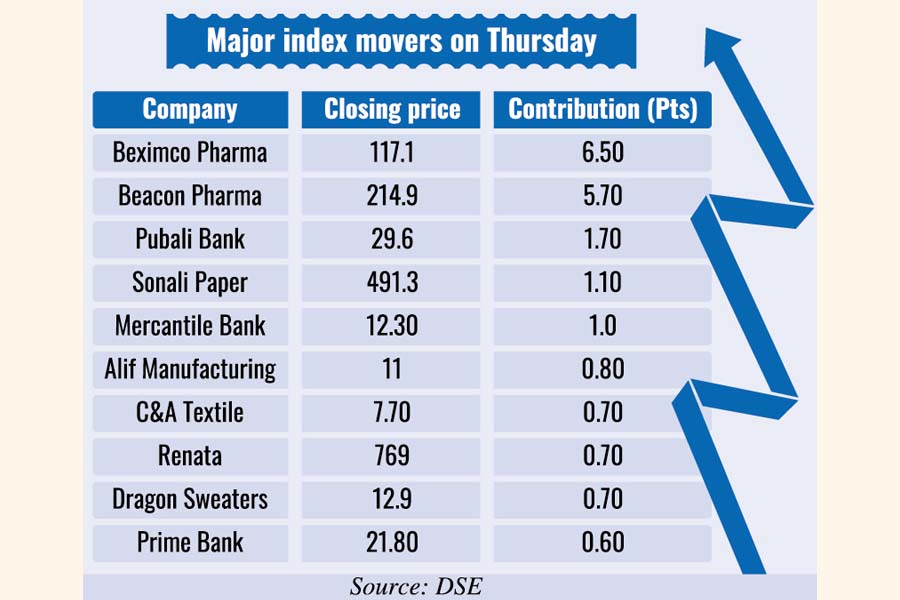 Price hikes of sector specific stocks such as Beximco Pharma, Beacon Pharma, Pubali Bank, Sonali Paper and Mercantile Bank, pushed the market up. They jointly accounted for nearly 16-point rise of the key index.