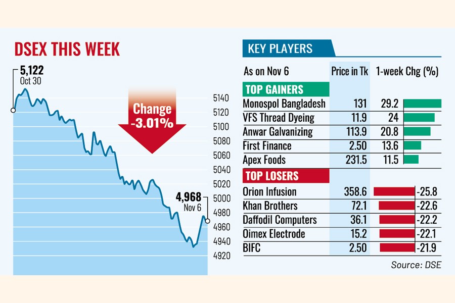 On the Dhaka Stock Exchange (DSE), all five trading days of the week ended in the red. The benchmark DSEX index settled the week 154 points, or 3.01 per cent, lower at 4,968, the lowest level since July 2 this year.