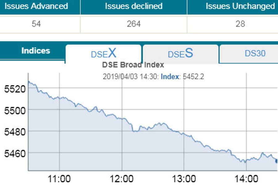 At the end of the session, DSEX, the prime index of the Dhaka Stock Exchange (DSE), went down by 69.97 points or 1.26 per cent to settle at more than three months low at 5,452.