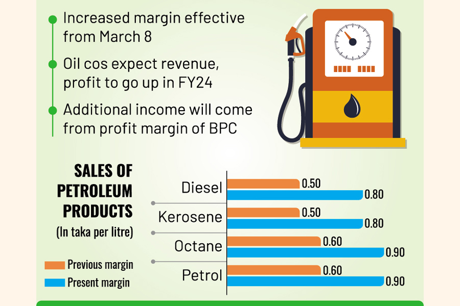 The sales margin of diesel and kerosene rose 60 per cent to Tk 0.80 per litre while the margin of octane and petrol went 50 per cent higher to Tk 0.90 per litre, according to a gazette notification bringing the changes into effect from March 8.