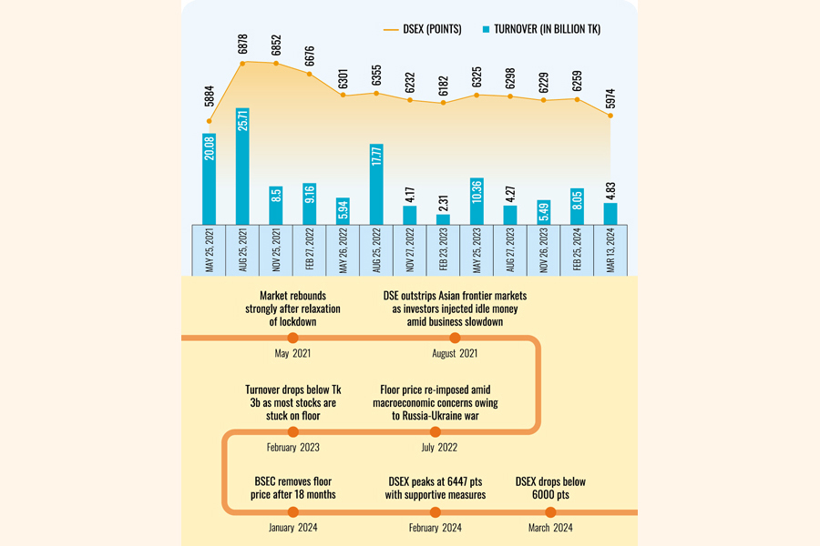 The benchmark index of the Dhaka Stock Exchange (DSE) on Wednesday went below the 6000-mark after it lost 192 points in five sessions in a row. The turnover also fell below Tk 5 billion.