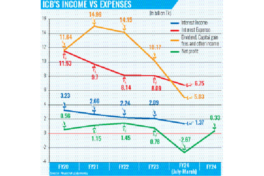 The ICB was able to earn a little more than Tk 5 billion in the form of dividend income, capital gains, commission, and other income during the first nine months to March, which resulted in an operating loss.