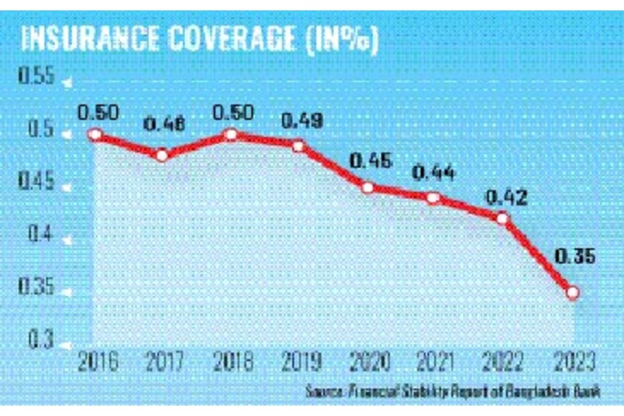 The Bangladesh Bank data shows a sharp decrease in the insurance penetration ratio in Bangladesh from 0.50 per cent in 2016 to 0.35 per cent in 2023.