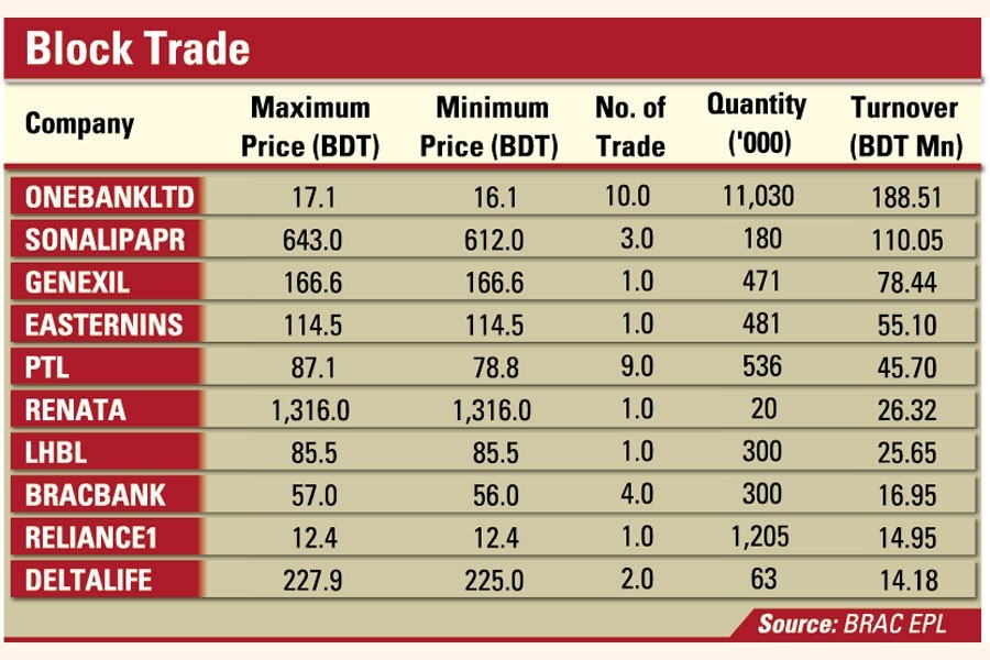 One Bank topped the scrip wise turnover chart with a value of Tk 1.42 billion followed by IFIC Bank Tk 683 million, NRB Commercial Bank Tk 531 million, First Security Islami Bank Tk 465 million and Fortune Shoes Tk 398 million.