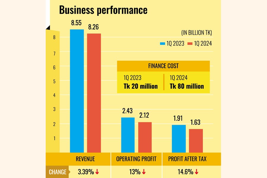 Its operating profit fell 13 per cent to Tk 2.12 billion in the first quarter through March, compared to the same quarter of the previous year. At the same time, revenue slid 3 per cent year-on-year in the quarter.