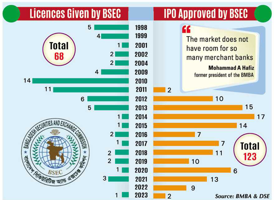 "The market does not have room for so many merchant banks," said Mohammad A Hafiz, former president of the Bangladesh Merchant Bankers Association (BMBA).