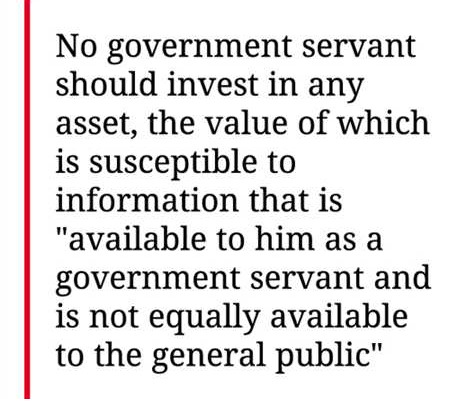 According to the Government Servants (Conduct) Rules 1979, no government servant should invest in any asset, the value of which is susceptible to information that is "available to him as a government servant and is not equally available to the general public".