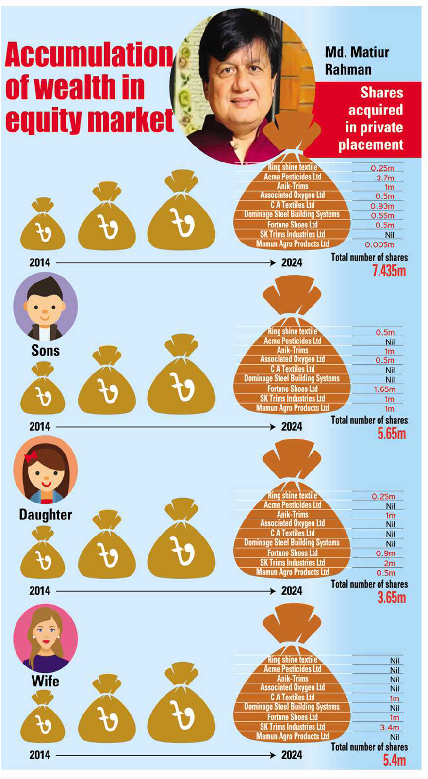 Fortune Shoes is not the only company Mr Rahman had put his money on. He acquired shares of more than a dozen companies during private placements at cheap prices and sold the holdings at high prices after the listing.