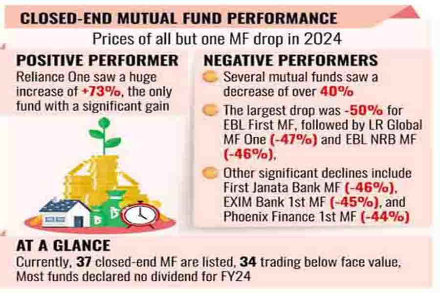As a result, the market capitalisation of the closed-end mutual funds shrank by Tk 13.66 billion, or 33 per cent, to Tk 27.81 billion in 2024.