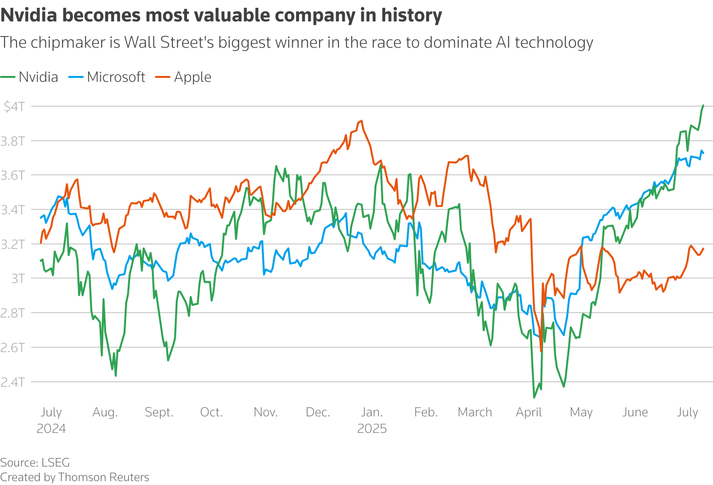 Nvidia's stock market value ended the trading session above $4 trillion for the first time on Thursday, solidifying the chipmaker's position as Wall Street's central player in a race to dominate AI technology.