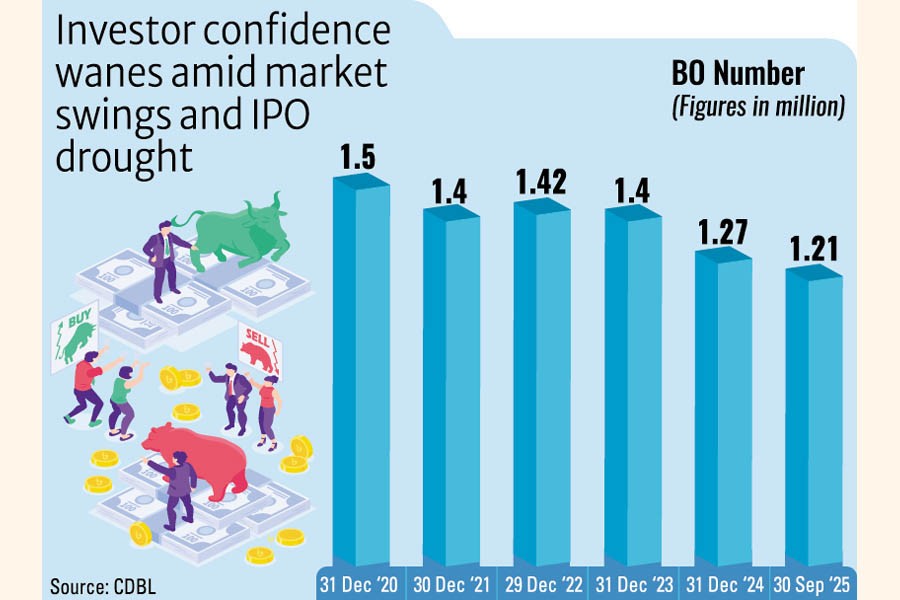 According to data from Central Depository Bangladesh Ltd (CDBL), the number of active BO accounts stood at just over 1.29 million as of September 30, down from nearly 1.36 million at the beginning of the year.