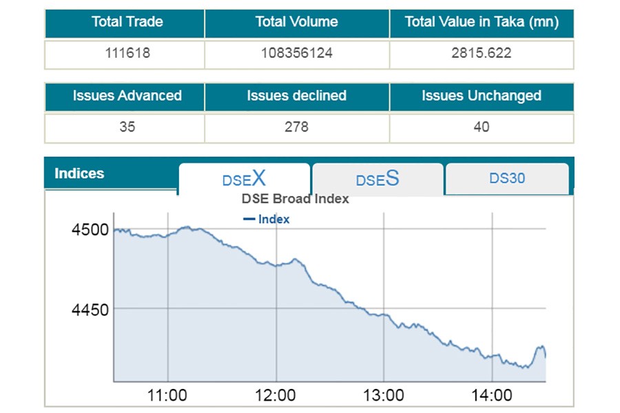 DSEX, the prime index of the Dhaka Stock Exchange, slumped 78.66 points or 1.74 per cent to settle at 4,419.