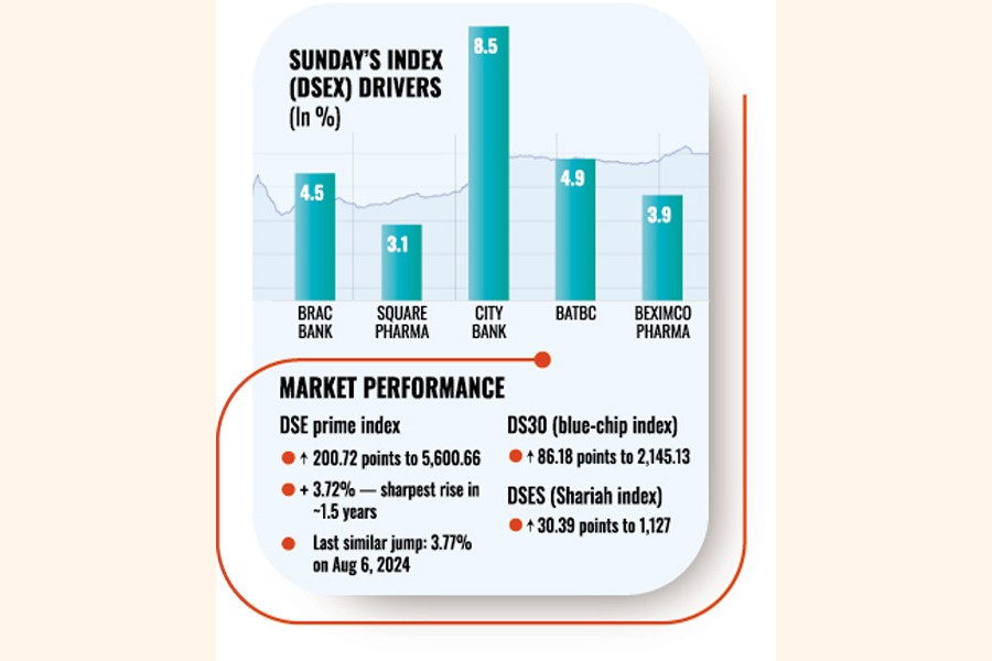 The prime index of the Dhaka Stock Exchange (DSE) rose by 200.72 points to settle at 5,600.66 on Sunday.