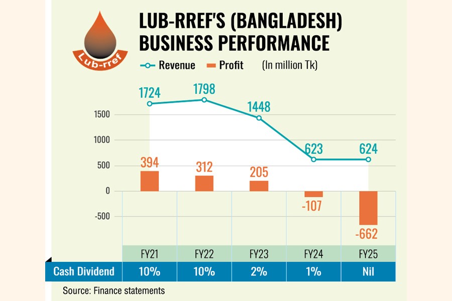 Following the earnings disclosure, Lub-rref's stock plunged nearly 19 per cent to Tk 10.3 per share on Sunday on the Dhaka Stock Exchange (DSE).