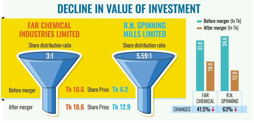 Investors of R.N. Spinning Mills and Far Chemical Industries have seen the value of their assets diminish in the last seven months after the listed companies merged with non-listed sister concerns.
