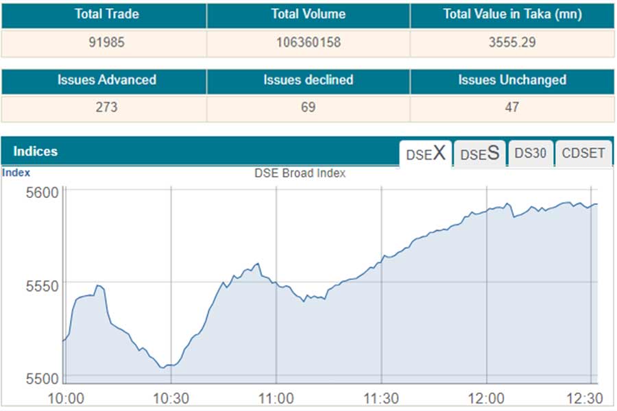 Accordingly, DSEX, the prime index of the Dhaka Stock Exchange (DSE), gained more than 70 points to 5,588 after two hours of trading at 12:00 noon, when the report was filed.