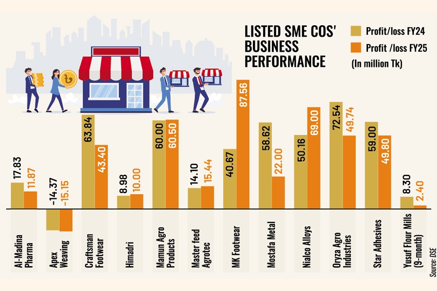 The SME companies' combined profitsfell around 9 per cent year-on-year to Tk 404 million in FY25, according to financial disclosures.