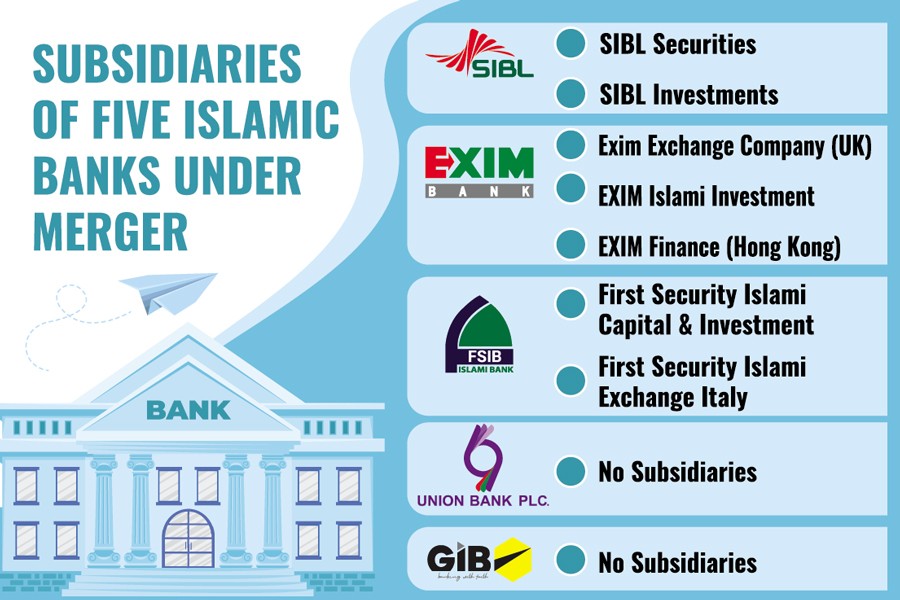 The five cash-trapped banks - Exim Bank, First Security Islami Bank (FSIBL), Social Islami Bank (SIBL), Union Bank, and Global Islami Bank - have recently been merged into Sammilito Islami Bank. Of them, Union Bank and Global Islami Bank have no subsidiaries.