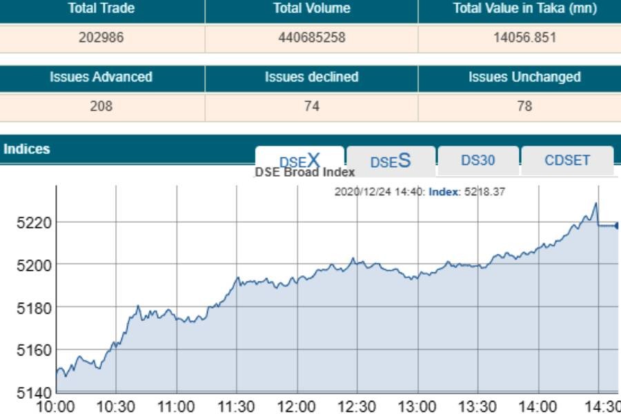 Two other indices also ended higher. The DS30 index, comprising blue chips, soared 40.50 points to finish at 1,876 and the DSE Shariah Index rose 17.37 points to close at 1,203.