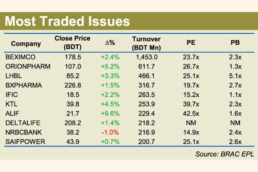 Beximco - the flagship company of Beximco Group- topped the turnover chart with shares worth Tk 1.45 billion changing hands, followed by Orion Pharma (Tk 611 million), LafargeHolcim (Tk 466 million), Beximco Pharma (Tk 316 million) and IFIC Bank (Tk 263 million).