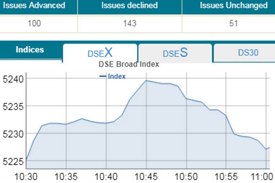 DSEX, the prime index of the DSE, went down by 3.33 points or 0.06 per cent to stand 5,221 points at 11:00am.