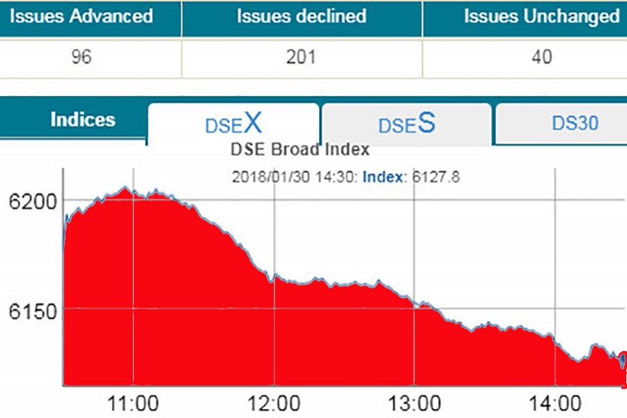 Two other indices of the premier bourse also ended lower. The DS30 index, comprising blue chips, fell nearly 27 points or 1.17 per cent to finish at 2,267 and DSES (Shariah) shed nearly 11 points or 0.76 per cent to close at 1,414.