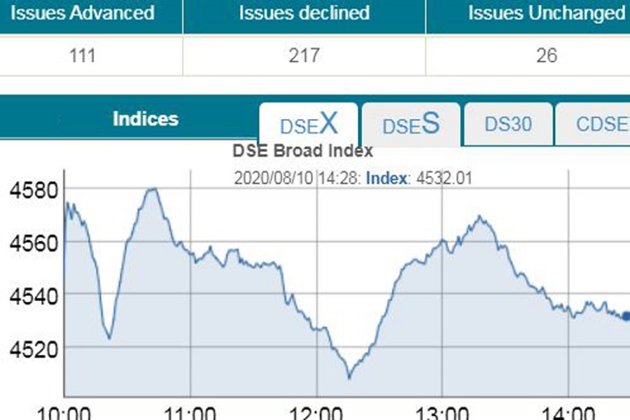 Finally, DSEX, the prime index of the Dhaka Stock Exchange (DSE), went down by 12.10 points or 0.26 per cent to close at 4533, after adding 468 points in the past 11 straight sessions.