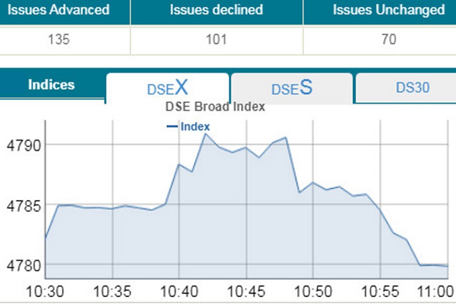 DSEX, the prime index of the DSE, went down by 2.08 points or 0.04 per cent to stand at 4,780 points at 11:00am.