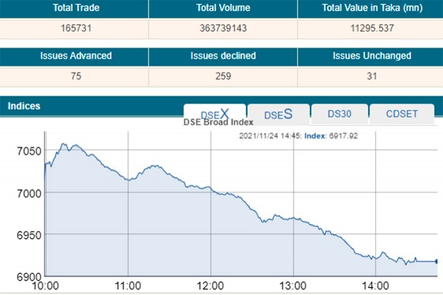 DSEX, the prime index of the Dhaka Stock Exchange (DSE), went down by 95.09 points or 1.35 per cent to settle at 6917.92.