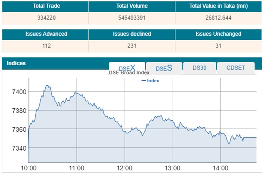 Losers took a strong lead over the gainers, as out of 374 issues traded, 231 closed lower, 112 higher and 31 remained unchanged on the DSE trading floor.
