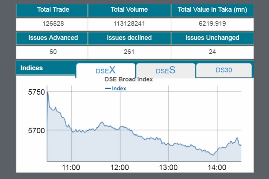 At the end of the session, DSEX, the prime index of the Dhaka Stock Exchange (DSE), went down by 8.38 points or 0.14 per cent to finish at 5,682.
