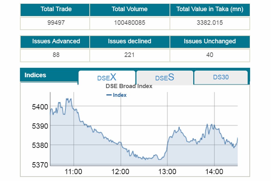 DSEX, the prime index of the Dhaka Stock Exchange (DSE), settle at 5,383, shedding 11.73 points or 0.21 per cent over the previous session.