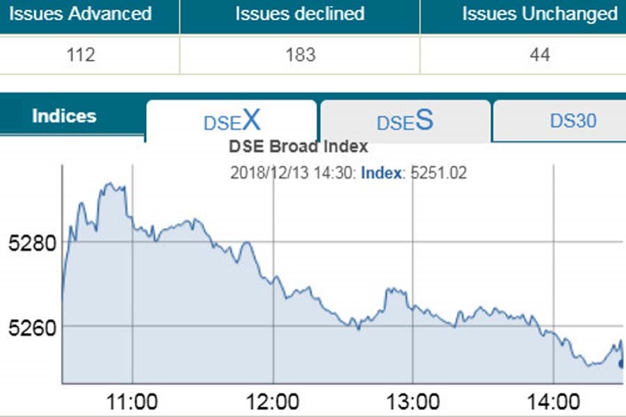 At the end of the session, DSEX, the prime index of the Dhaka Stock Exchange (DSE), settled at 5,251, losing 14.82 points or 0.28 per cent over the previous day.