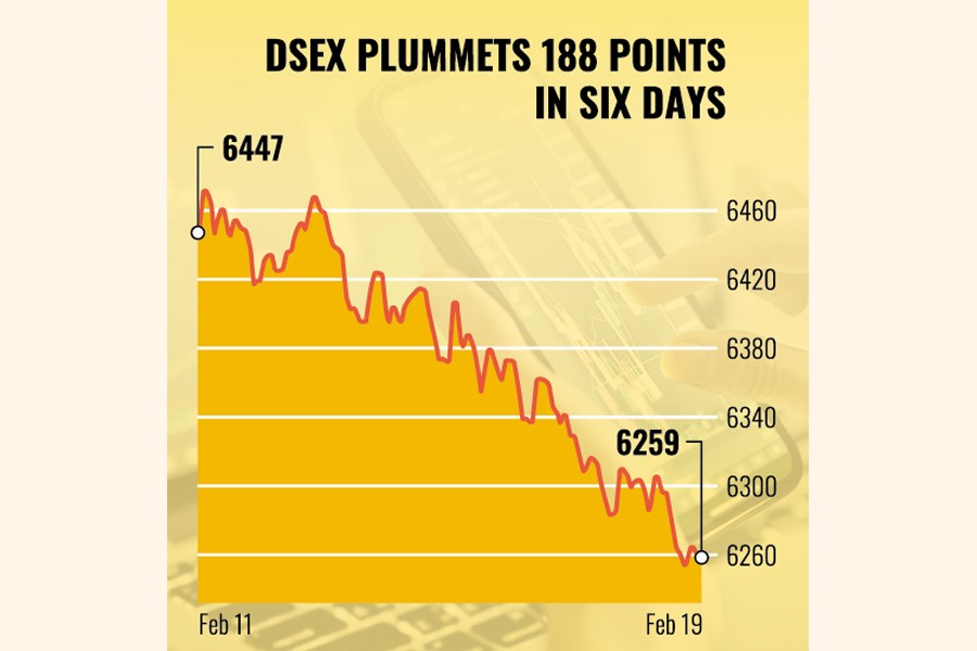 The DSEX, the benchmark index of the Dhaka Stock Exchange (DSE), finally went down more than 24 points to settle at 6,259. The DSEX shed 188 points in the past six trading days.