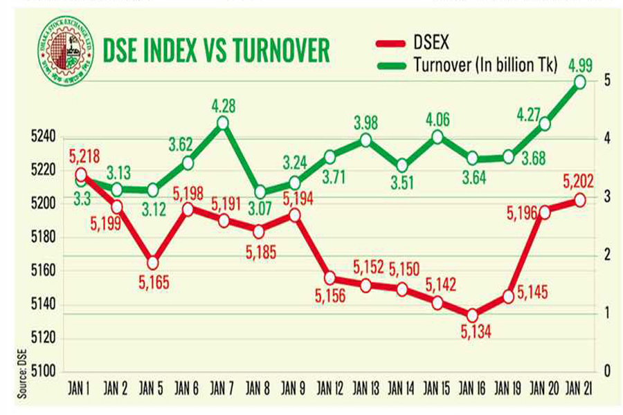 Along with the rising turnover, DSEX, the benchmark index of the Dhaka Stock Exchange, was up about 7.0 points or 0.13 per cent to 5,202.