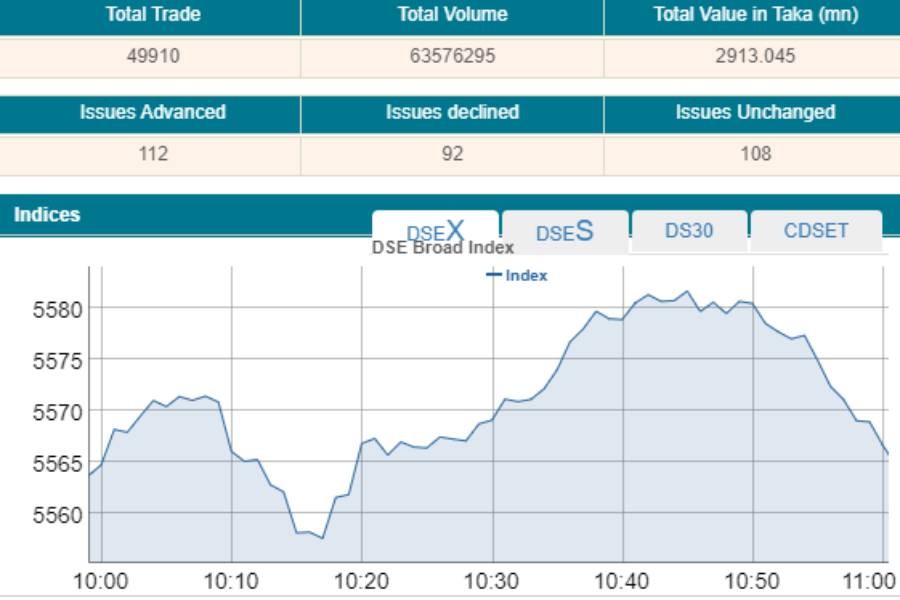 DSEX, the prime index of the DSE, went up by 1.05 points or 0.02 per cent to stand 5,564 points till then.