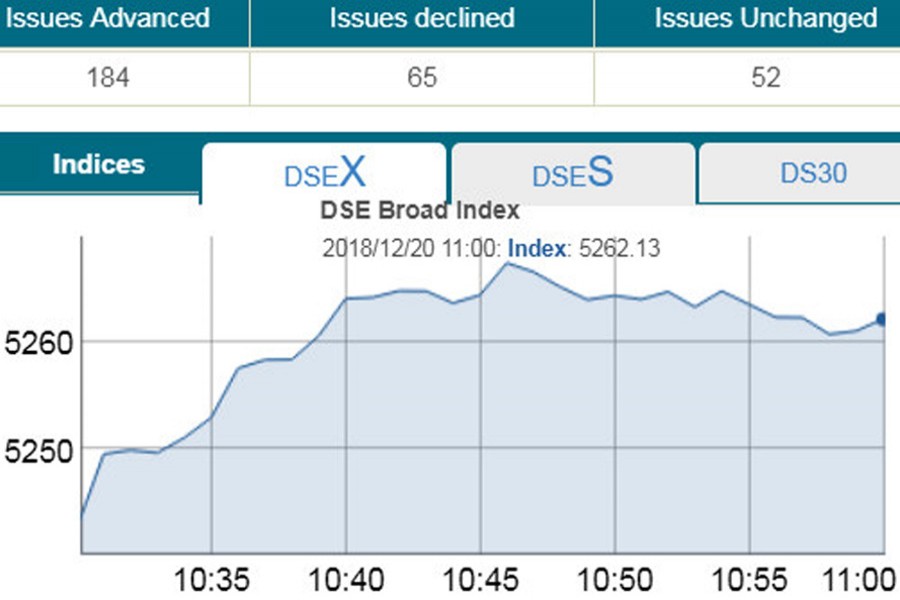 DSEX, the prime index of the DSE, went up by 19.99 points or 0.38 per cent to stand 5,262 points at 11:00am.