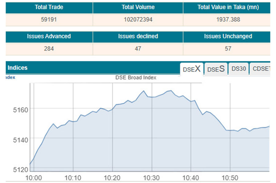 Following the previous day’s positive closing, the prime index of the Dhaka Stock Exchange (DSE), went up by more than 45 points or 0.88 per cent to 5,167 at 11:00 am, when the report was filed.